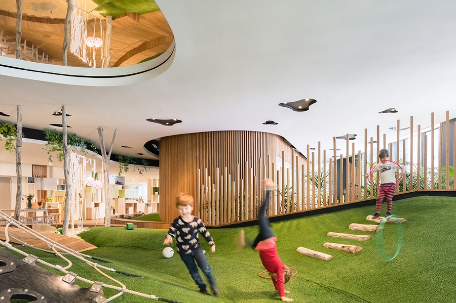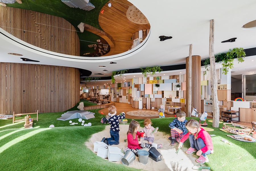 Commissioned to design the new Centre, architects Collins and Turner developed an environment aimed at enticing and enriching young minds and bodies. Featuring both a continuous landscape for play and a stimulating environment for learning, the Centre incorporates undulating landscape surfaces, mirrored ceilings to provide a magical illusion of height, and a variety of sensory-rich experience spaces to inspire curiosity and support discovery.