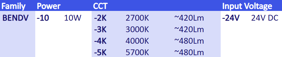 | Correlated Colour Temperature (CCT) | 2700K / 3000K / 4000K / 5000K |