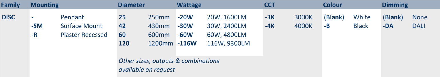 Available in a wide range of wattages, sizes and mounting configurations. The Disc SUS is available in matte white trim as standard, with custom colours are available upon request.