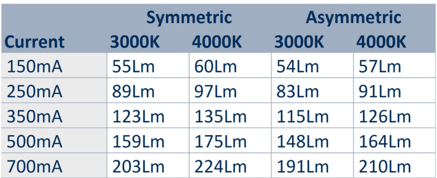 | Lumens | 115Lm @350mA (3000K Asymmetric) |