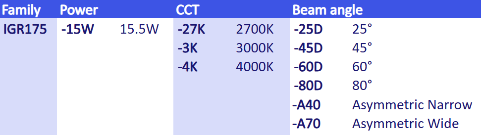 | Beam Angle | 25° | 45° | 60° | 80° | Asymmetric |