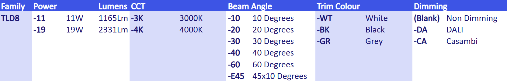 | Beam Angle | 10° | 20° | 30° | 40° | 60° | 45×10° |